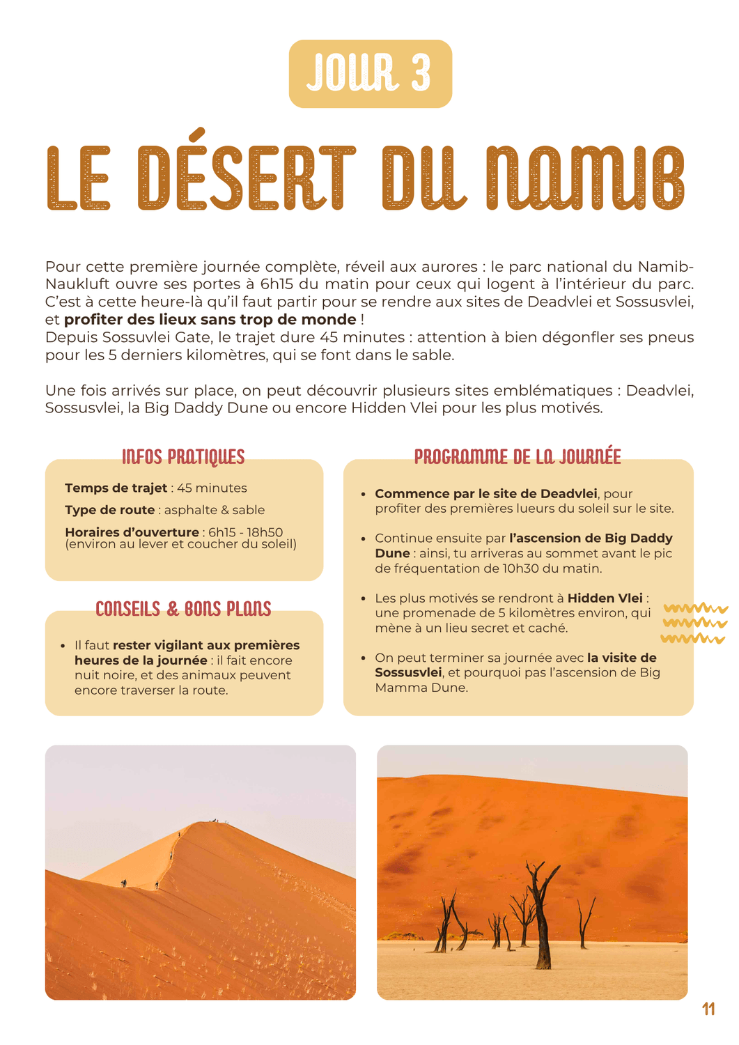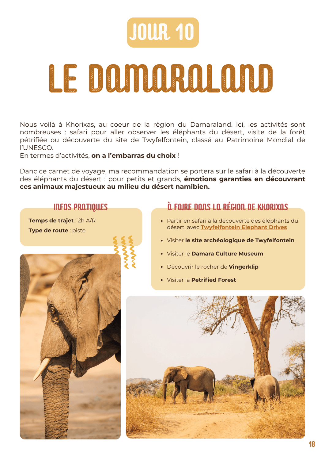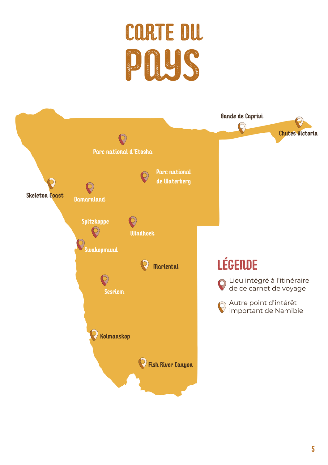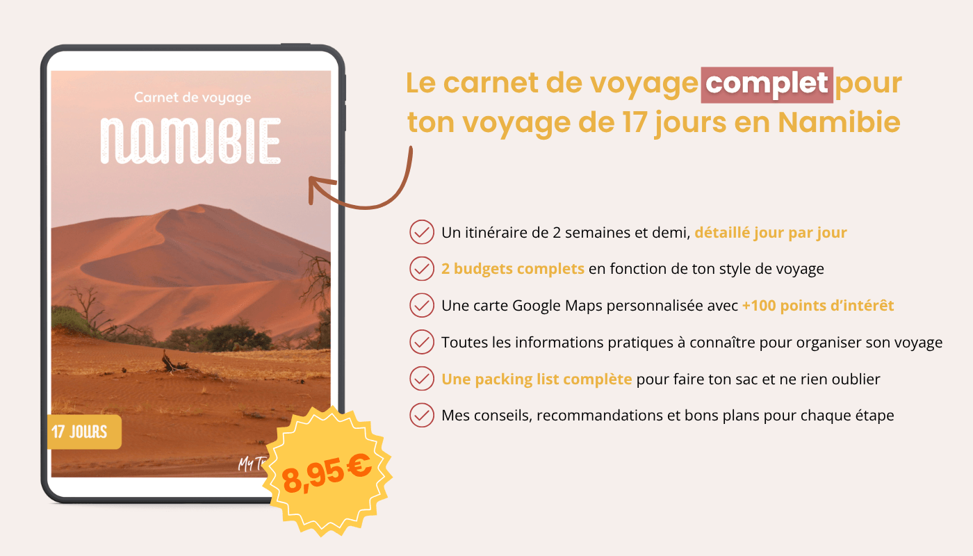 Avec un itinéraire détaillé de 17 jours, des recommandations, bons plans et bonnes adresses à chaque étape du voyage, ce carnet de voyage t'emmènera découvrir les plus beaux endroits de Namibie, en alliant histoire, nature, aventure et faune sauvage.