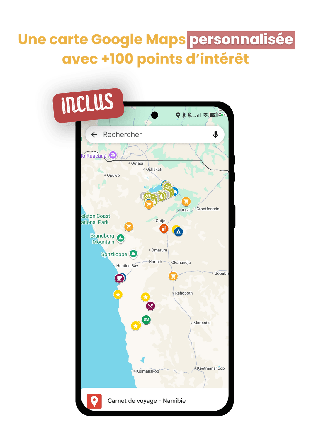 Le Carnet de voyage inclut une carte Google Maps personnalisée, qui recense tous les points d'intérêt à connaître pour cet itinéraire en Namibie :